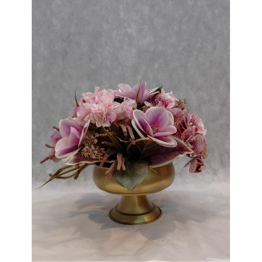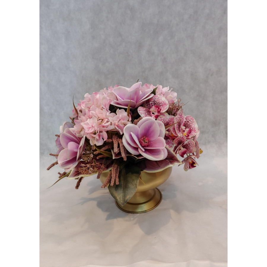 ARRANJO COM FLORES PERMANENTES HORTÊNCIAS E MAGNÓLIAS